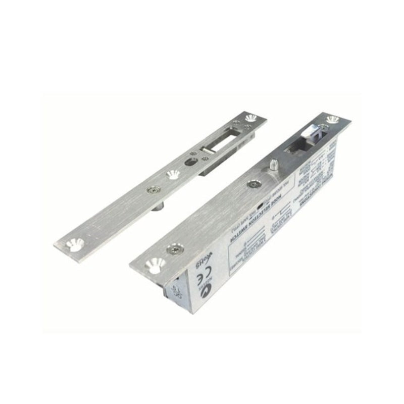The patented HL1260 is a high torque motor driven hook lock for a sliding door. It can be installed vertically in the door frame (lock style) with the strike plate mounted on the edge of the door.