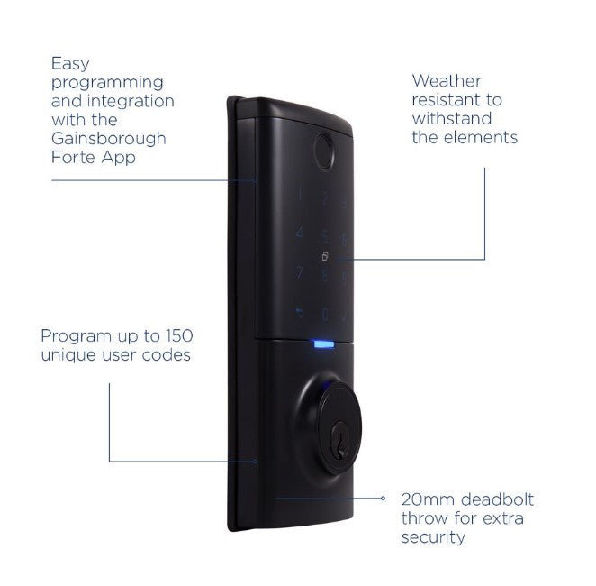 The Gainsborough Mode Smart Lever offers secure and flexible access with multiple entry methods including RFID, fingerprint reader, backlit keypad, voice control (via the Gainsborough Forte App), and a key override.