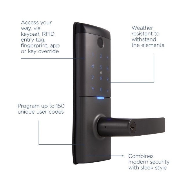 Experience flexible and secure home access with the Gainsborough Mode Smart Deadbolt. Designed for convenience and control, this smart lock offers multiple entry options, including RFID, fingerprint reader, backlit keypad, voice control (via the Gainsborough Forte App), and traditional key override.
