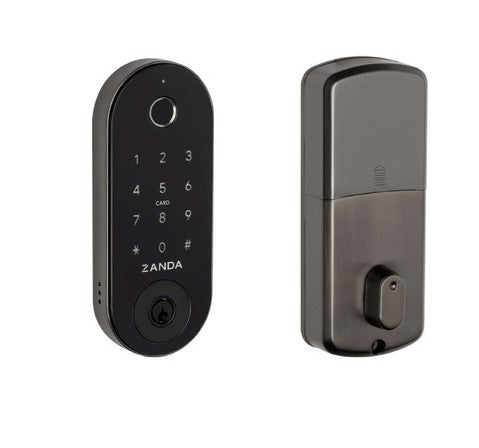 The Zanda Stealth Smart Lock Deadbolt in Graphite Nickel offers secure keyless entry with fingerprint, PIN code, RFID card, and mechanical key override options. Designed for timber and aluminum doors with a 60mm backset, it supports remote access via the Zanda app and gateway. The lock is IP66 weather-rated and operates in temperatures from -25°C to 70°C. Powered by a rechargeable lithium-ion battery with 9–12 months of life, it features a durable zinc alloy construction and a 7-year mechanical warranty.